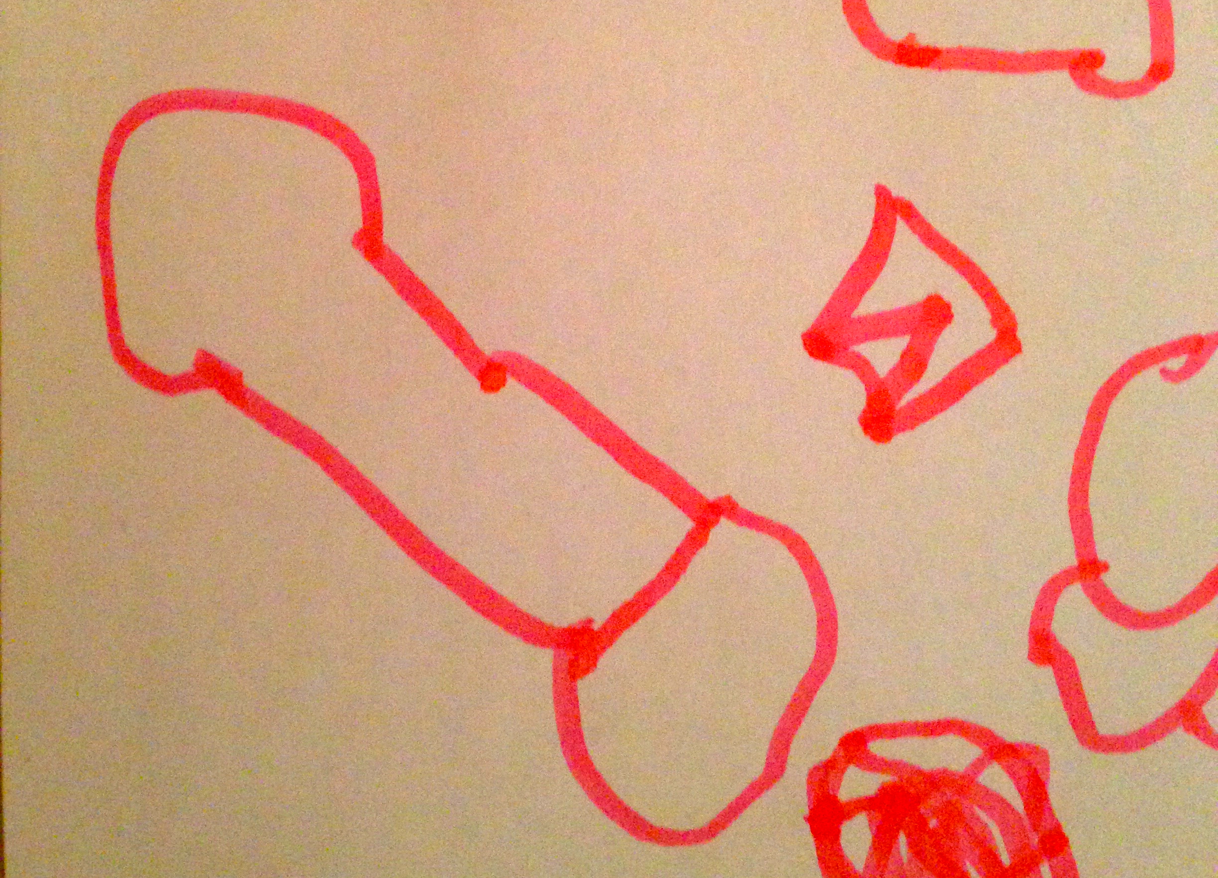 Am I worried that all he seems to draw are penises? A little, I guess. I’d probably laugh it off altogether if he realized he was drawing penises over and over and over again, but he doesn’t. He comes up to me with this really bright, proud smile on his face and says, “daddy, check out my…” fill in the blank here. Sometimes it’s a race car, a space ship, a sky scraper, a boat, a coffee table, a Christmas present, a dog…It could be anything, except that every time, the picture he’s drawing is obviously a penis. Doesn’t he see it? It’s like the worst ink blot test ever. Little penis. Little balls. Plain as day.