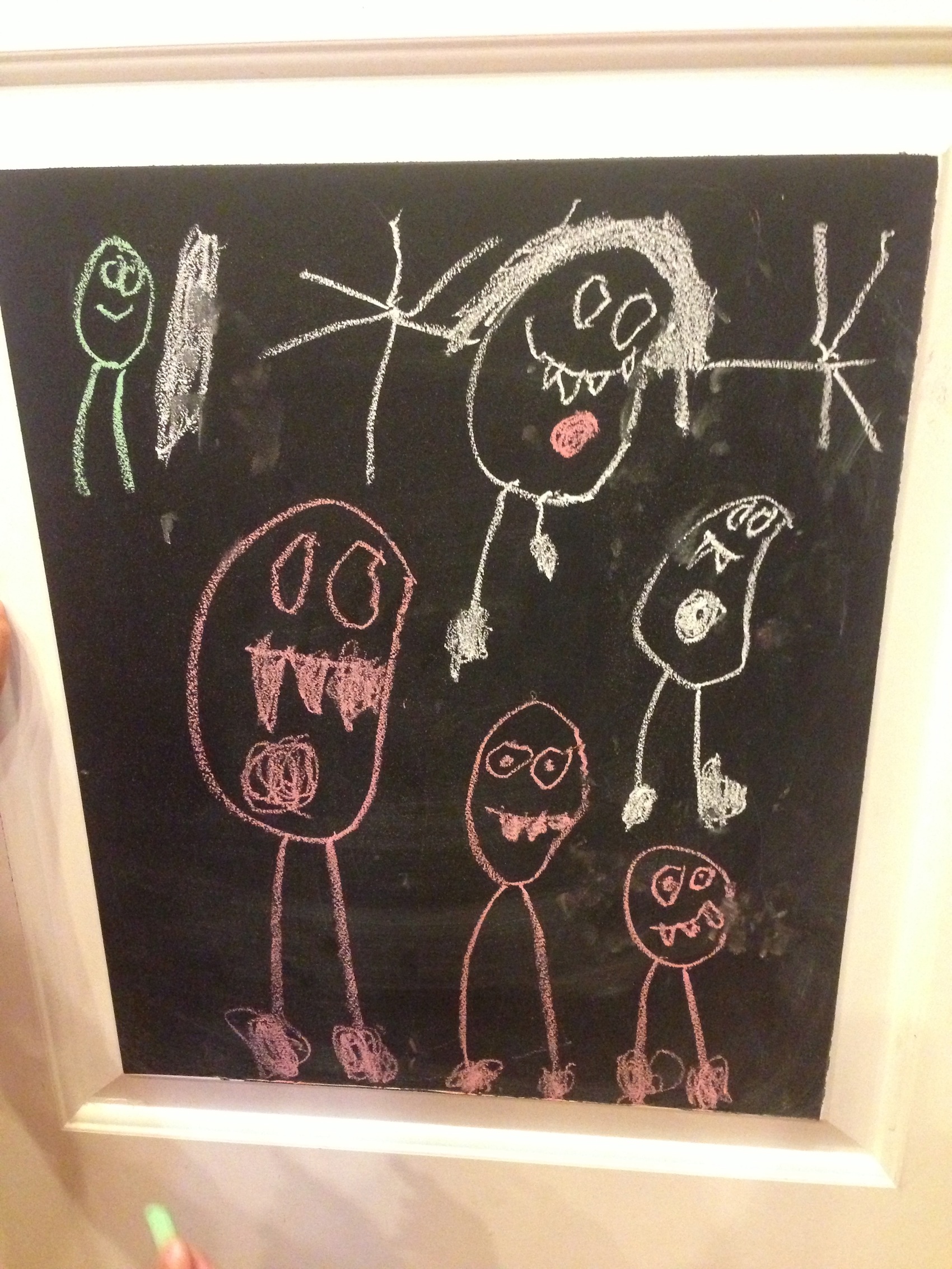 Apparently not. Now that she has the motor skills to draw, does she draw rainbows? Stick figures holding hands in a meadow? No. She keeps drawing these really disturbing monsters with exaggerated fangs. The picture above, on the chalkboard, is a family of potato monsters. She also draws pumpkin monsters. Kitty monsters. Flower monsters. They all have the same happy but crazed look to them. The kind of monsters that are singing a song about butterflies one minute, then trying to give the neighbor’s dog a juice box enema (which pretty much describes my daughter, too).